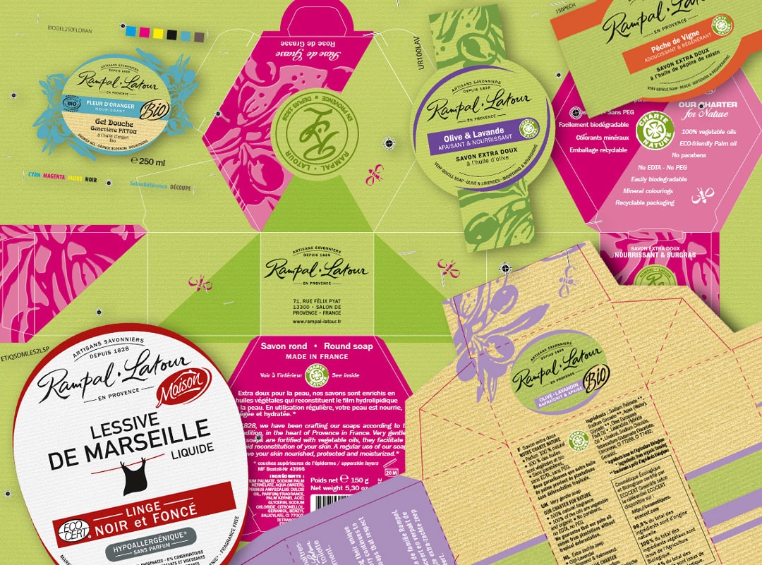 … de packagings et d’étiquettes parmi les nombreux documents réalisés depuis 2006 pour la Savonnerie Rampal Latour : packaging (sous forme de boîtes, sachets…), affiches, posters, plaquette, dépliants, flyers, encarts publicitaires, cartographie, enseignes, panneaux d’habillage de façades, kakemonos, frise historique.
