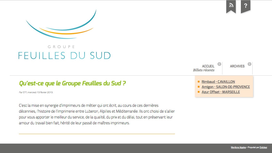 Après le rachat, par l’imprimerie Rimbaud, de l’imprimerie Amigon dont j’avais créé le site Internet d’origine, début 2009 j’ai été chargé de travailler sur un nouveau site regroupant les trois entreprises composant le Groupe Feuilles du Sud, à partir de la charte graphique de la nouvelle plaquette.